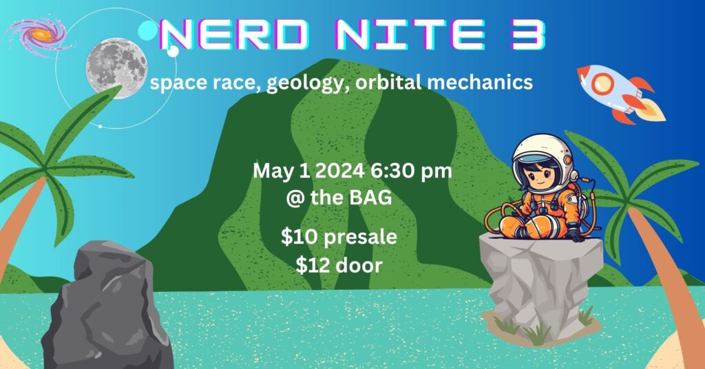 Last Nerd Nite for this season until the fall! Join us for another fun and interesting night of learning, drinking and snacking. This round we will be hearing presentations about The Future of Space, Geology Phenomenas , and Orbital Mechanics.
